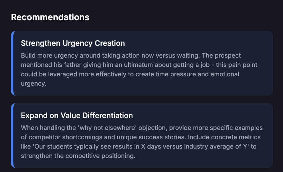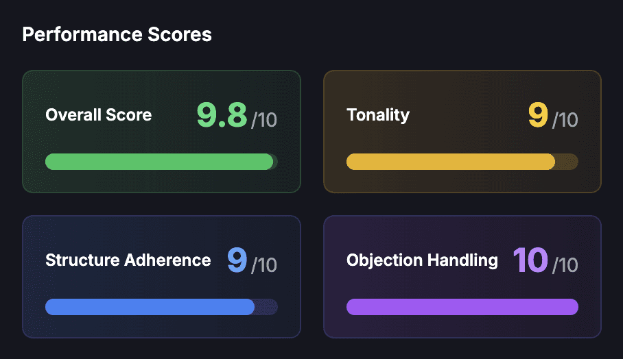 See your tonality, question quality, objection handling effectiveness, and areas where you excelled or struggled